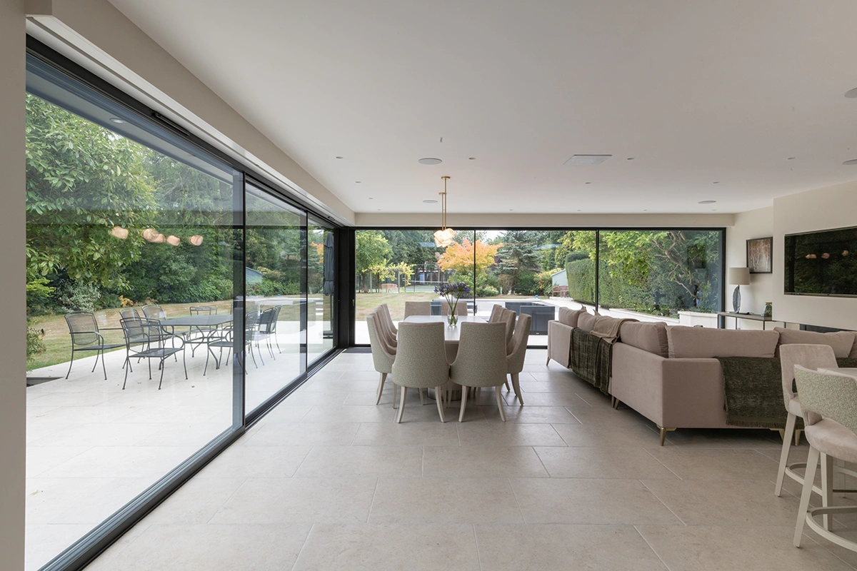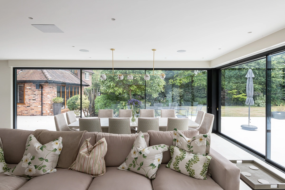 An ethereal quality transcends this wonderful living space in the heart of Berkshire. With double-aspect glazing providing a seamless transition from inside to outside, we dressed this space with elegant full height roller blinds, offering both diffusion of harsh sunlight when required, and a feeling of warmth during the colder weather.The blinds are fully automated and synchronised with the lighting and audio controls, whilst being expertly concealed behind a box pelmet matching the rest of the walls.